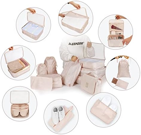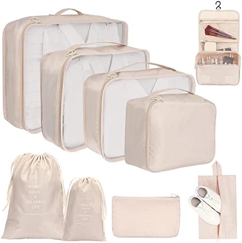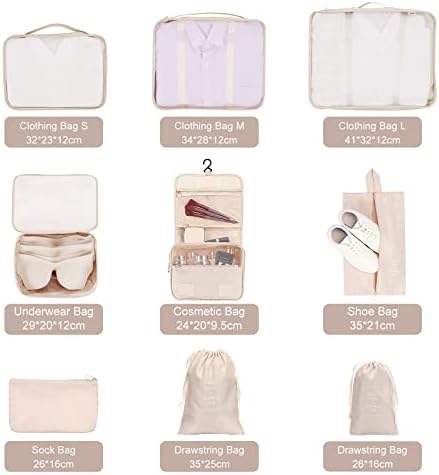 Lot de 9 Sacs de Voyage: Contient 3 sacs à vêtements avec filet de différentes tailles, 1 organiseur de sous-vêtements, 1 trousse de toilette avec crochet pour les cosmétiques et articles de toilette, 1 sac à chaussures, 2 sac à cordon de serrage, 1 petits sacs pour chaussettes ou autres petits objets. Gardez votre valise propre et bien rangée pour une expérience de voyage relaxante et confortable.